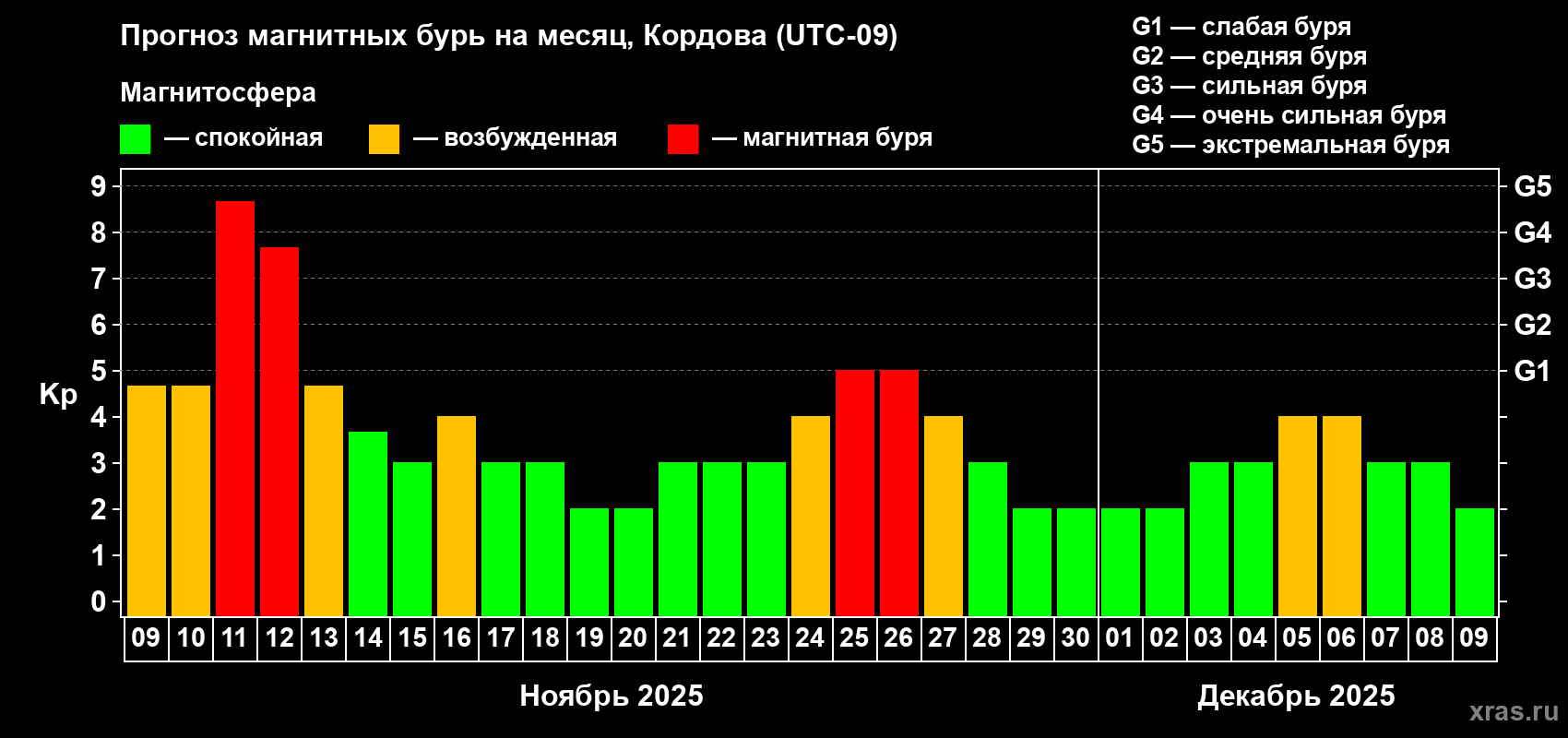 Прогноз магнитных бурь в Кордове — 9 ноября 2025 года