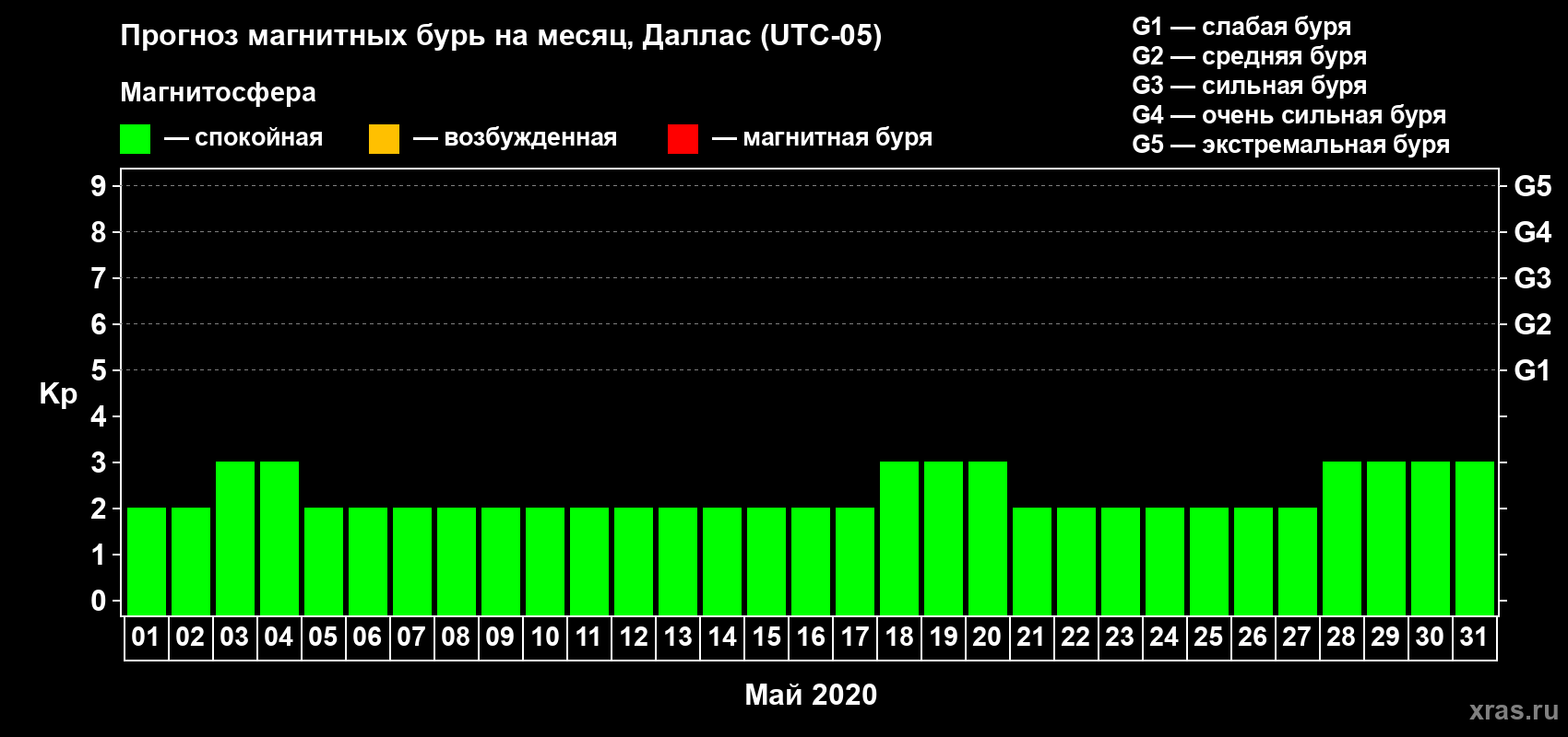 Прогноз максимального суточного геомагнитного индекса Kp на 1 месяц (31 день) с 01 мая по 31 мая 2020 г