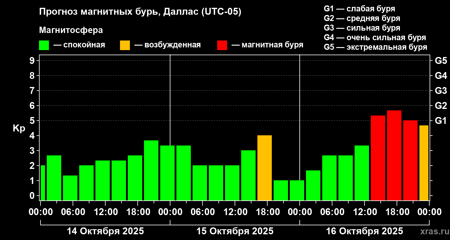 Прогноз магнитных бурь в Далласе — 14 октября 2025 года
