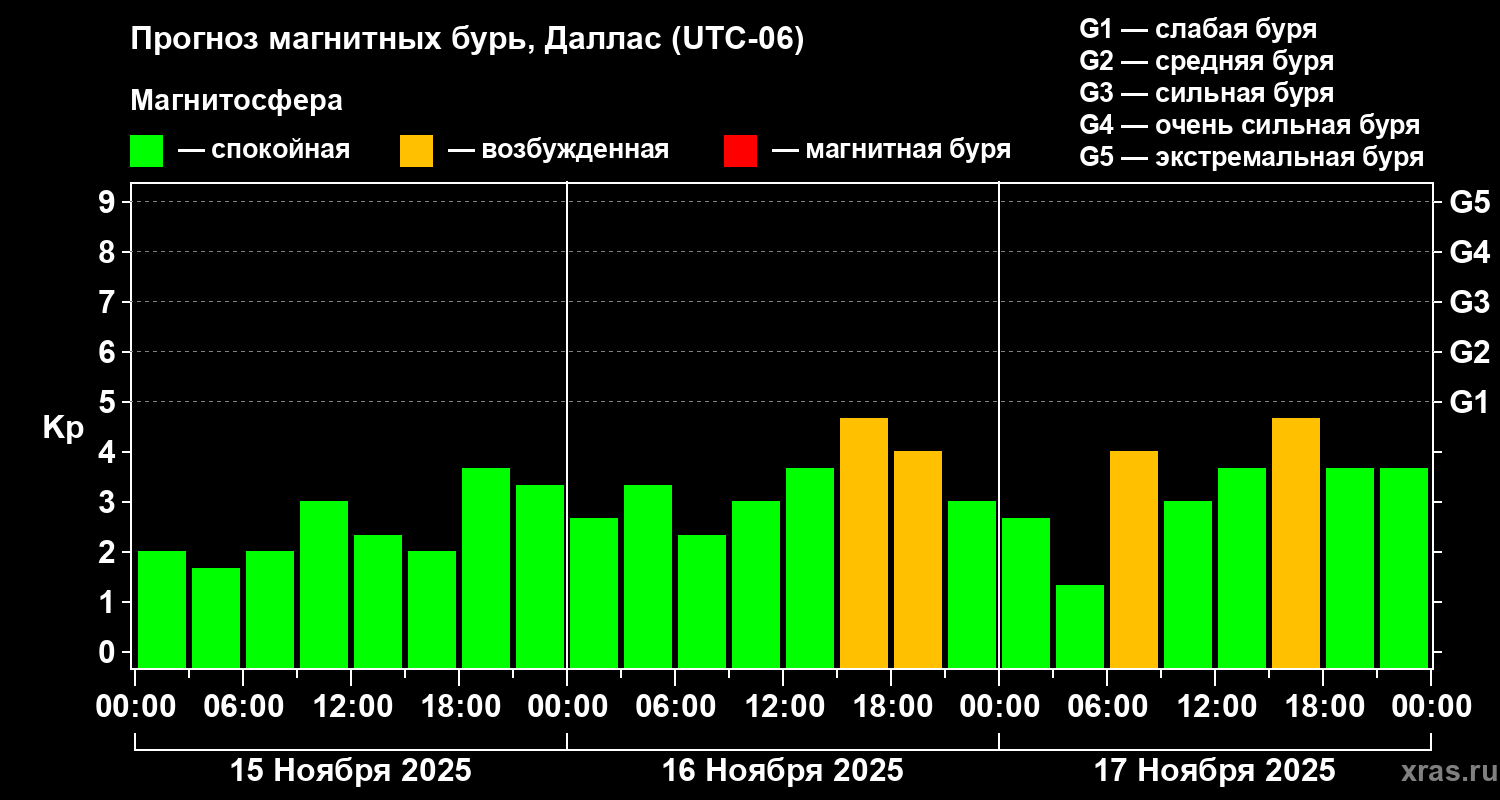 Прогноз магнитных бурь в Далласе на 15 ноября 2025 года