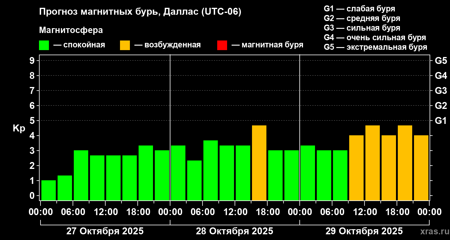 Прогноз магнитных бурь в Далласе на 27 октября 2025 года