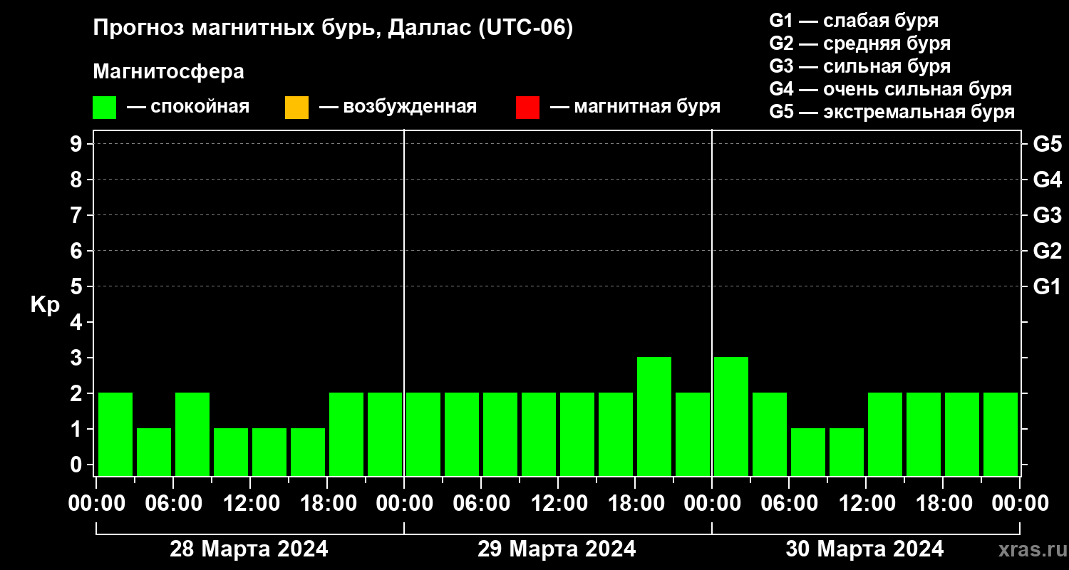 Прогноз магнитных бурь в Далласе на 28 марта 2024 года