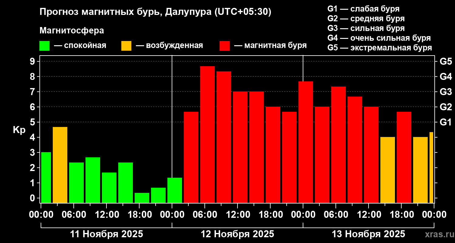 Прогноз магнитных бурь в Далупуре на 11 ноября 2025 года