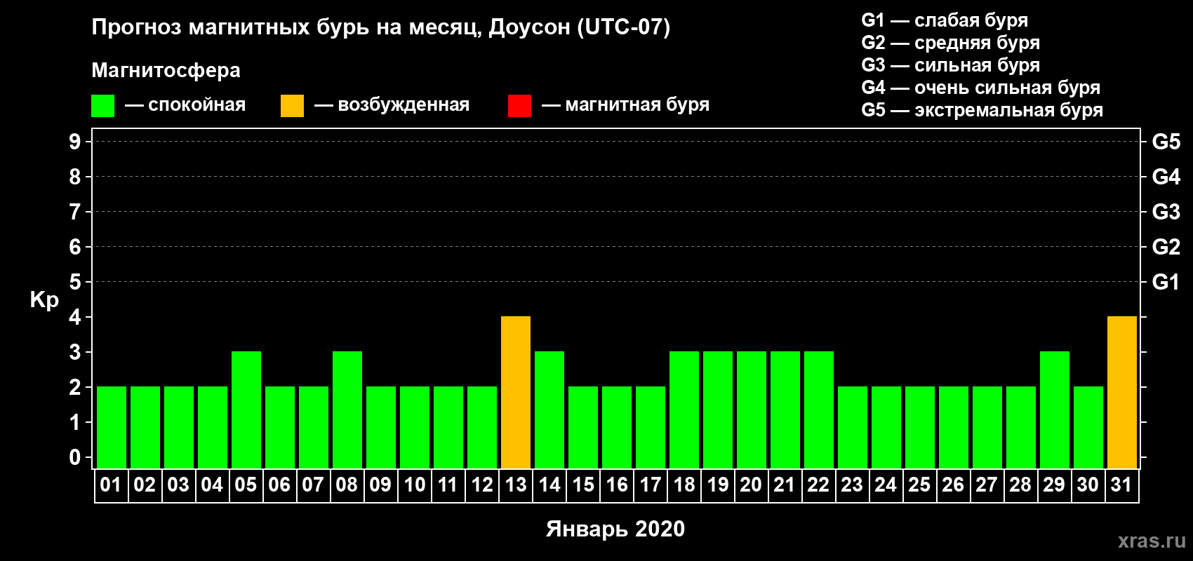 Прогноз магнитных бурь в Доусоне — 1 января 2020 года