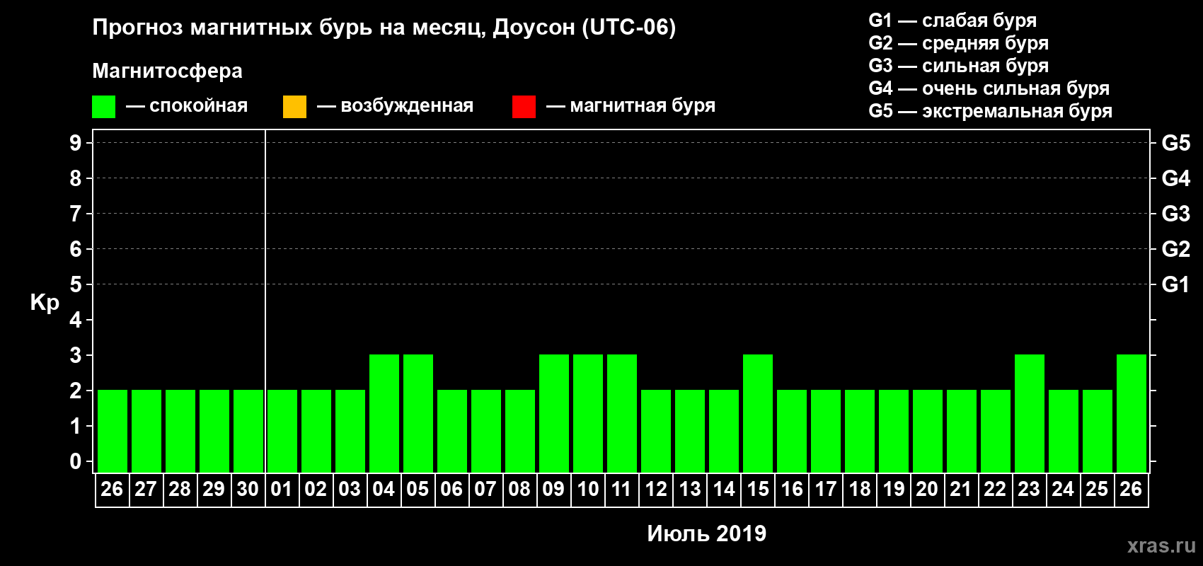 Прогноз магнитных бурь в Доусоне — 26 июня 2019 года