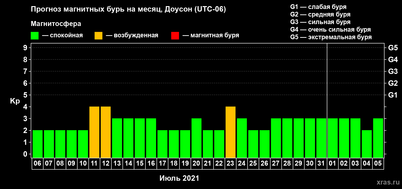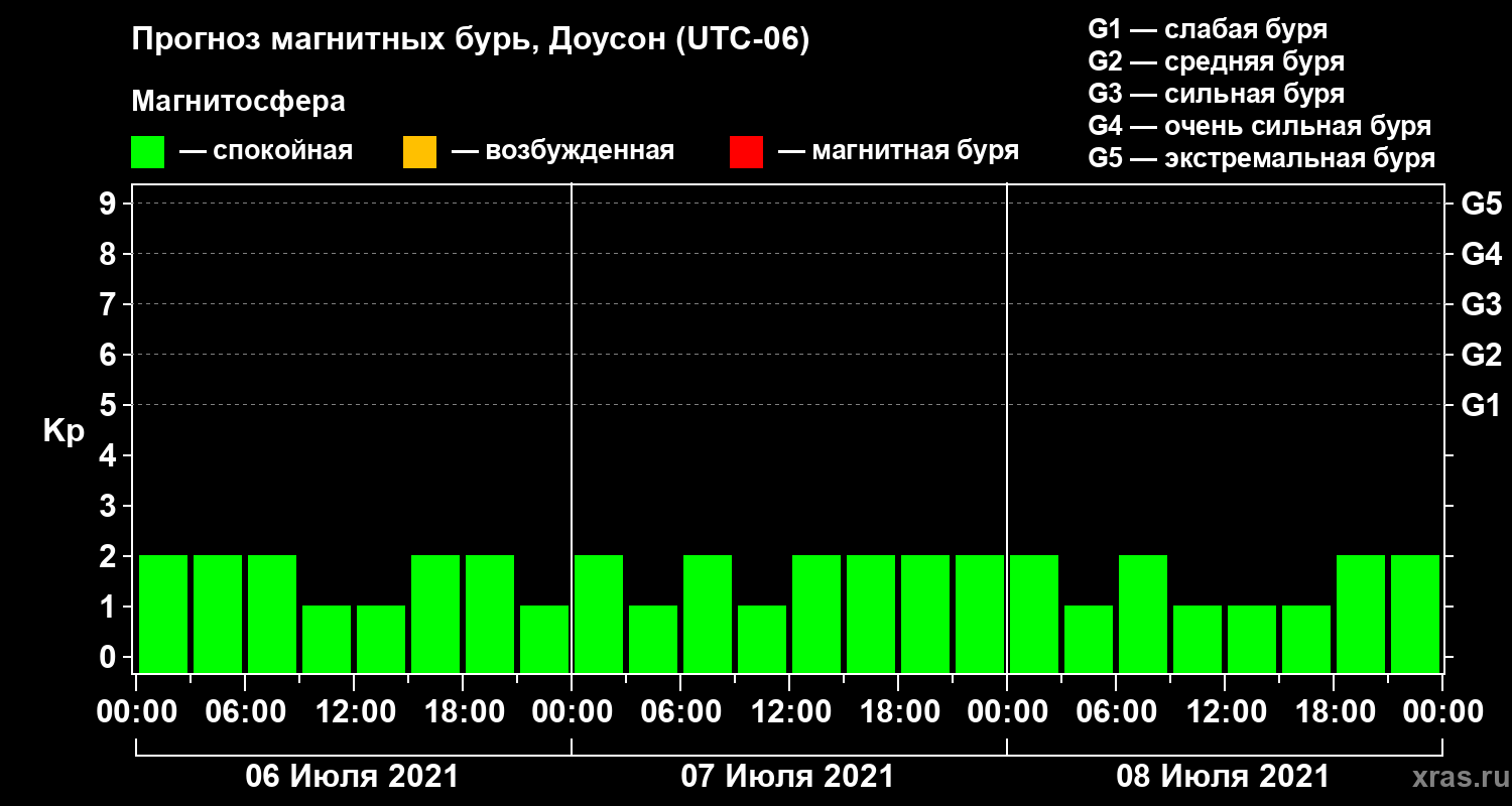 Прогноз магнитных бурь в Доусоне — 6 июля 2021 года