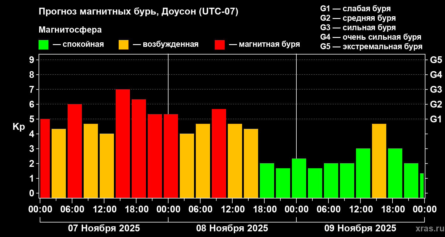 Прогноз магнитных бурь в Доусоне — 7 ноября 2025 года