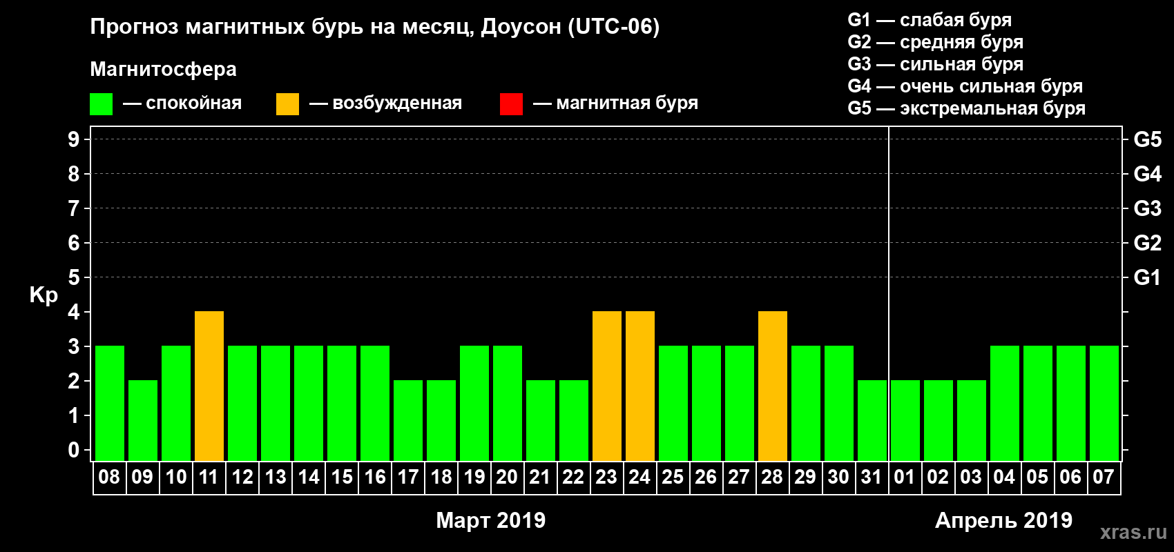 Прогноз магнитных бурь в Доусоне — 8 марта 2019 года