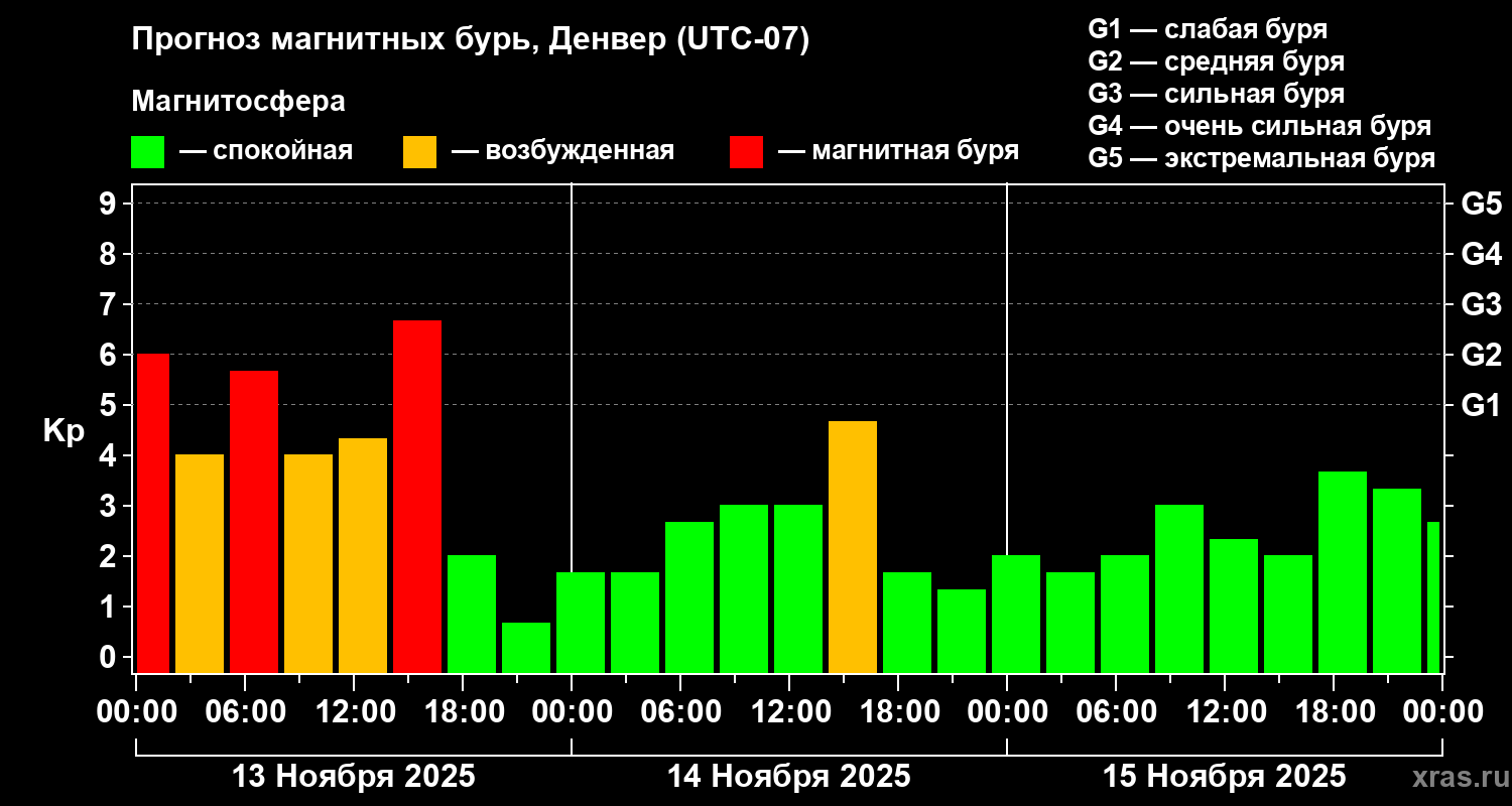 Прогноз магнитных бурь в Денвере на 13 ноября 2025 года