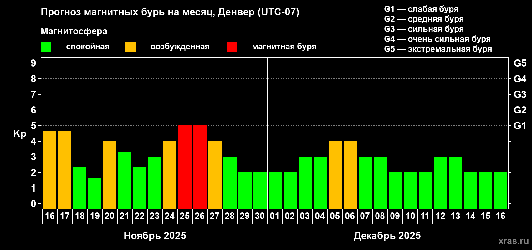 Прогноз магнитных бурь в Денвере — 16 ноября 2025 года