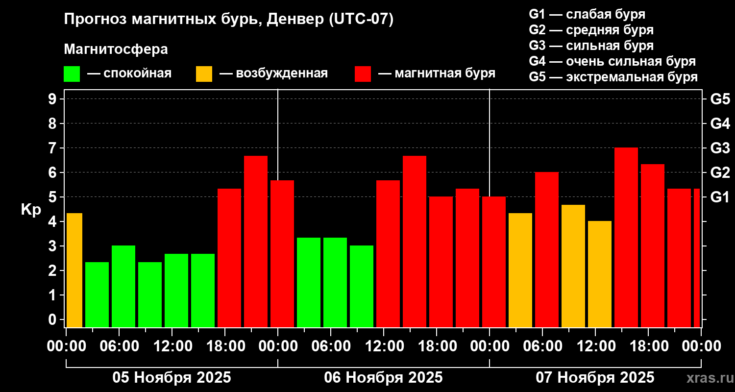 Прогноз магнитных бурь в Денвере на 5 ноября 2025 года