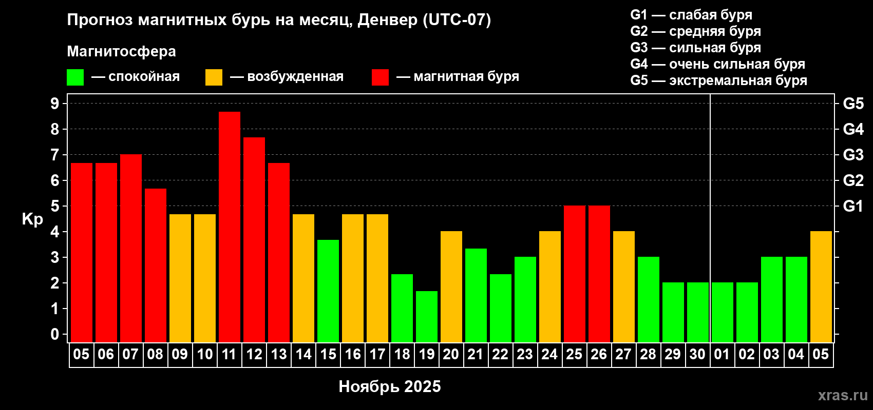 Прогноз магнитных бурь в Денвере — 5 ноября 2025 года
