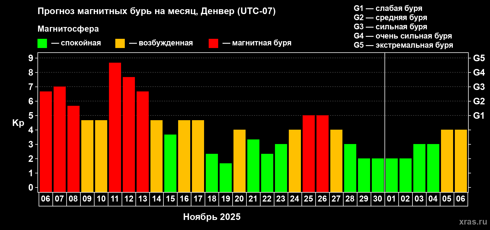Прогноз магнитных бурь в Денвере — 6 ноября 2025 года