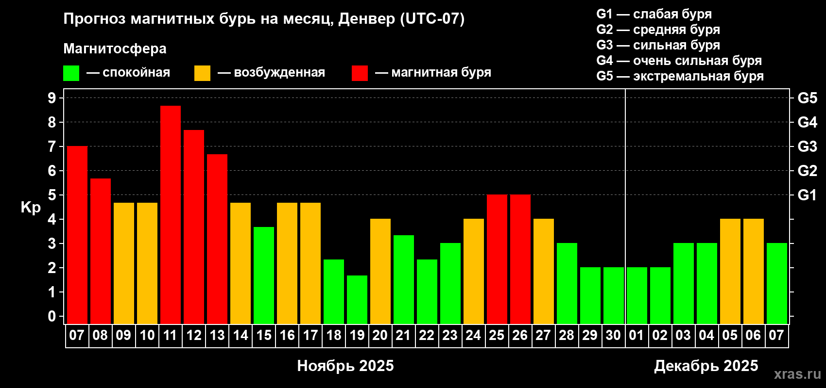 Прогноз магнитных бурь в Денвере на 7 ноября 2025 года