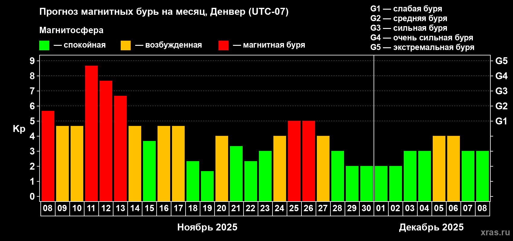 Прогноз магнитных бурь в Денвере — 8 ноября 2025 года