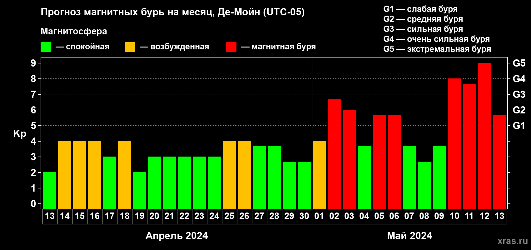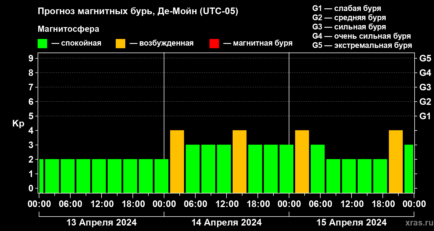 Прогноз магнитных бурь в Де-Мойне — 13 апреля 2024 года