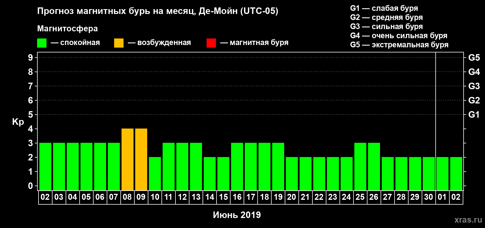 Прогноз магнитных бурь в Де-Мойне на 2 июня 2019 года