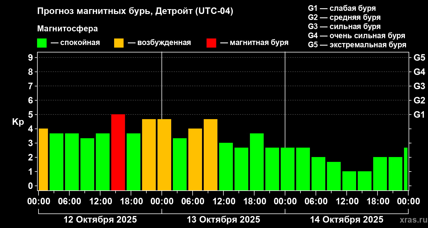 Прогноз магнитных бурь в Детройте на 12 октября 2025 года