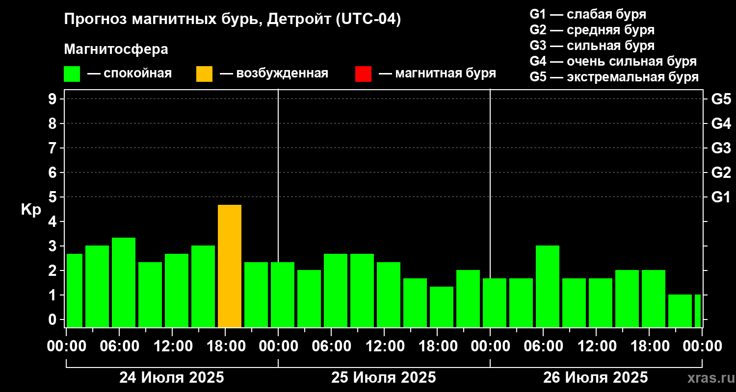 Прогноз магнитных бурь в Детройте на 24 июля 2025 года