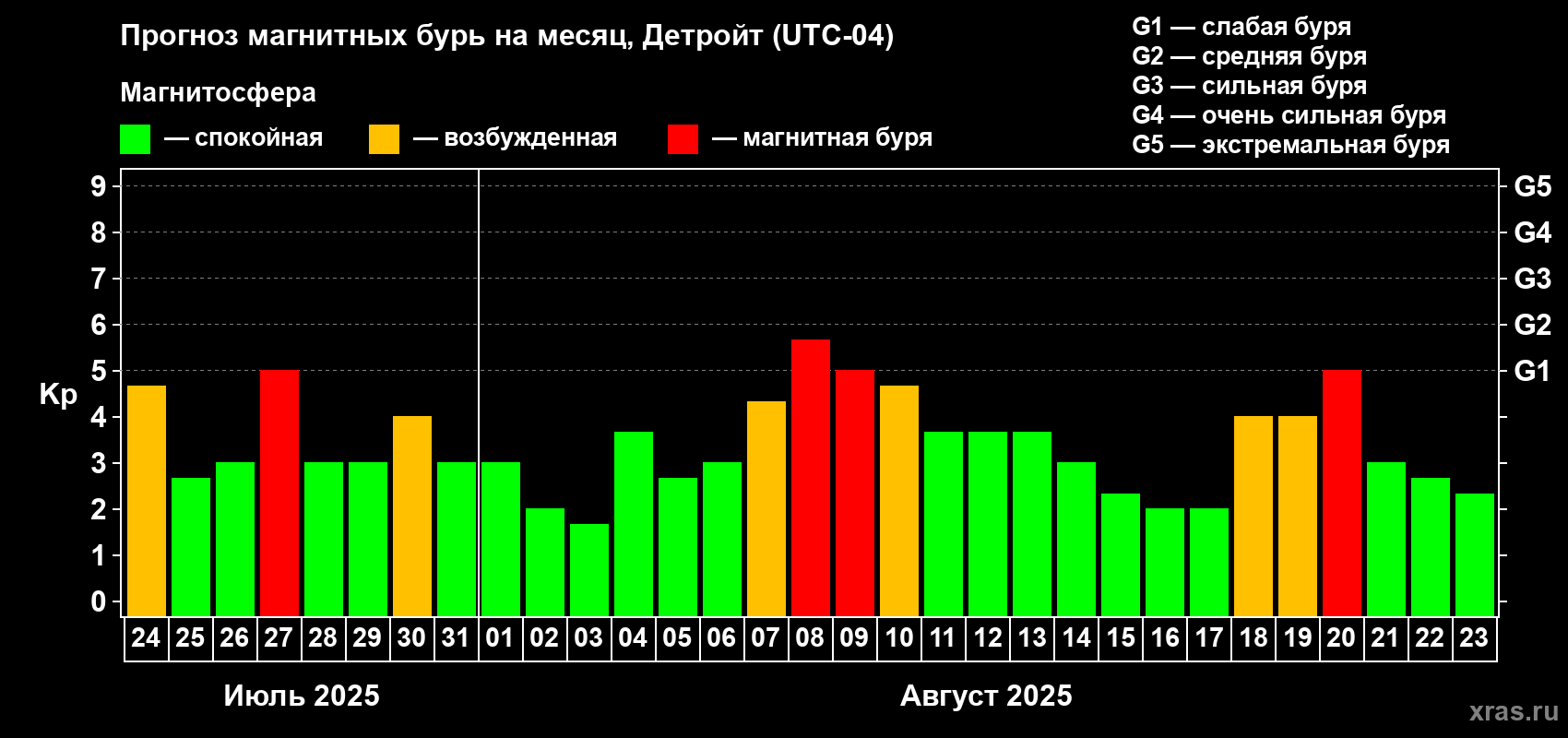 Прогноз магнитных бурь в Детройте — 24 июля 2025 года