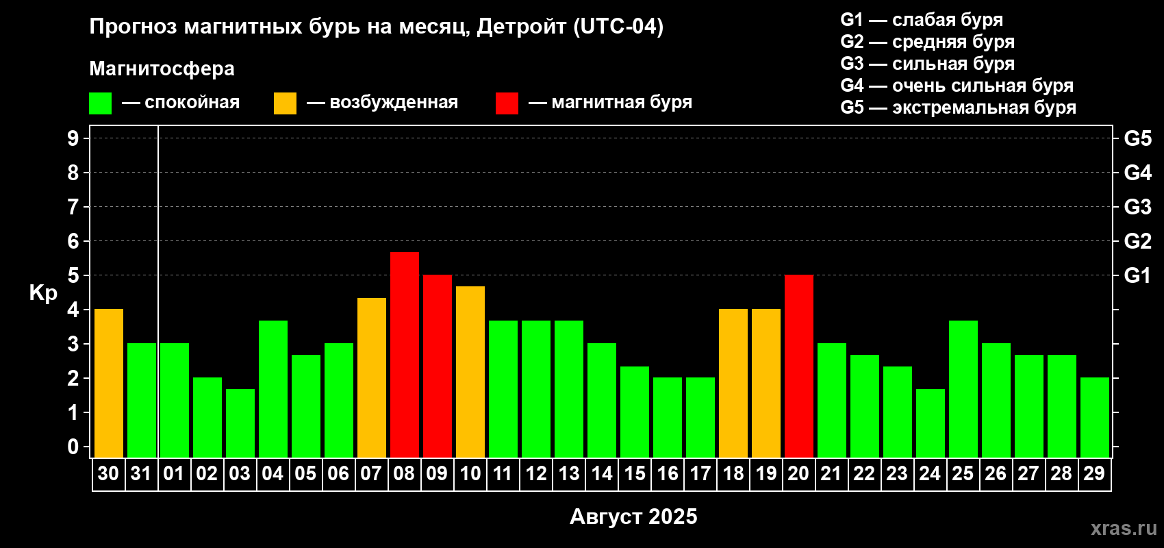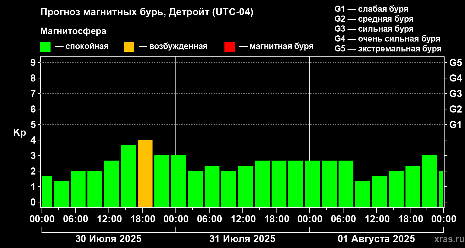 Прогноз магнитных бурь в Детройте на 30 июля 2025 года