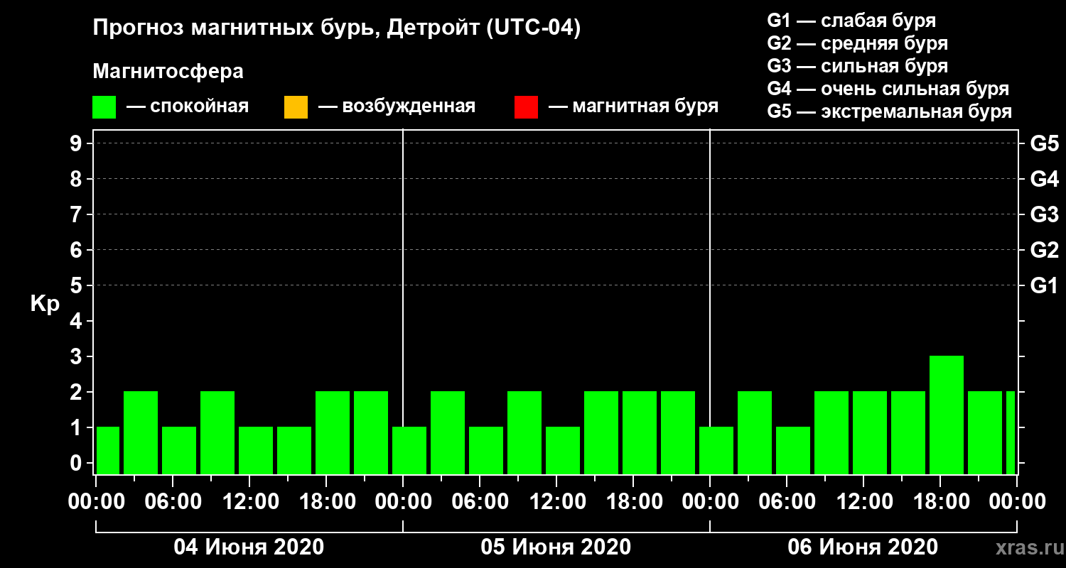 Прогноз магнитных бурь в Детройте на 4 июня 2020 года