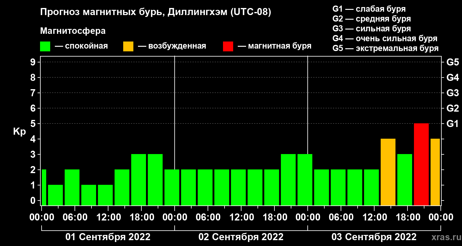 Прогноз магнитных бурь в Диллингхэме на 1 сентября 2022 года