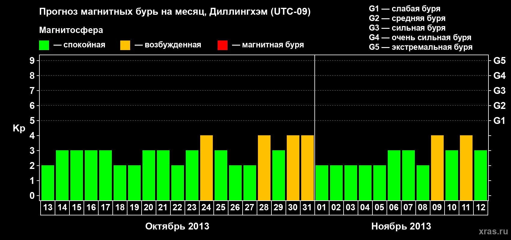 Прогноз магнитных бурь в Диллингхэме — 13 октября 2013 года