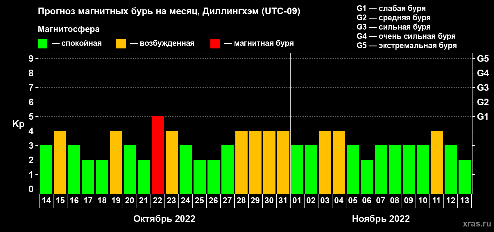 Прогноз магнитных бурь в Диллингхэме — 14 октября 2022 года