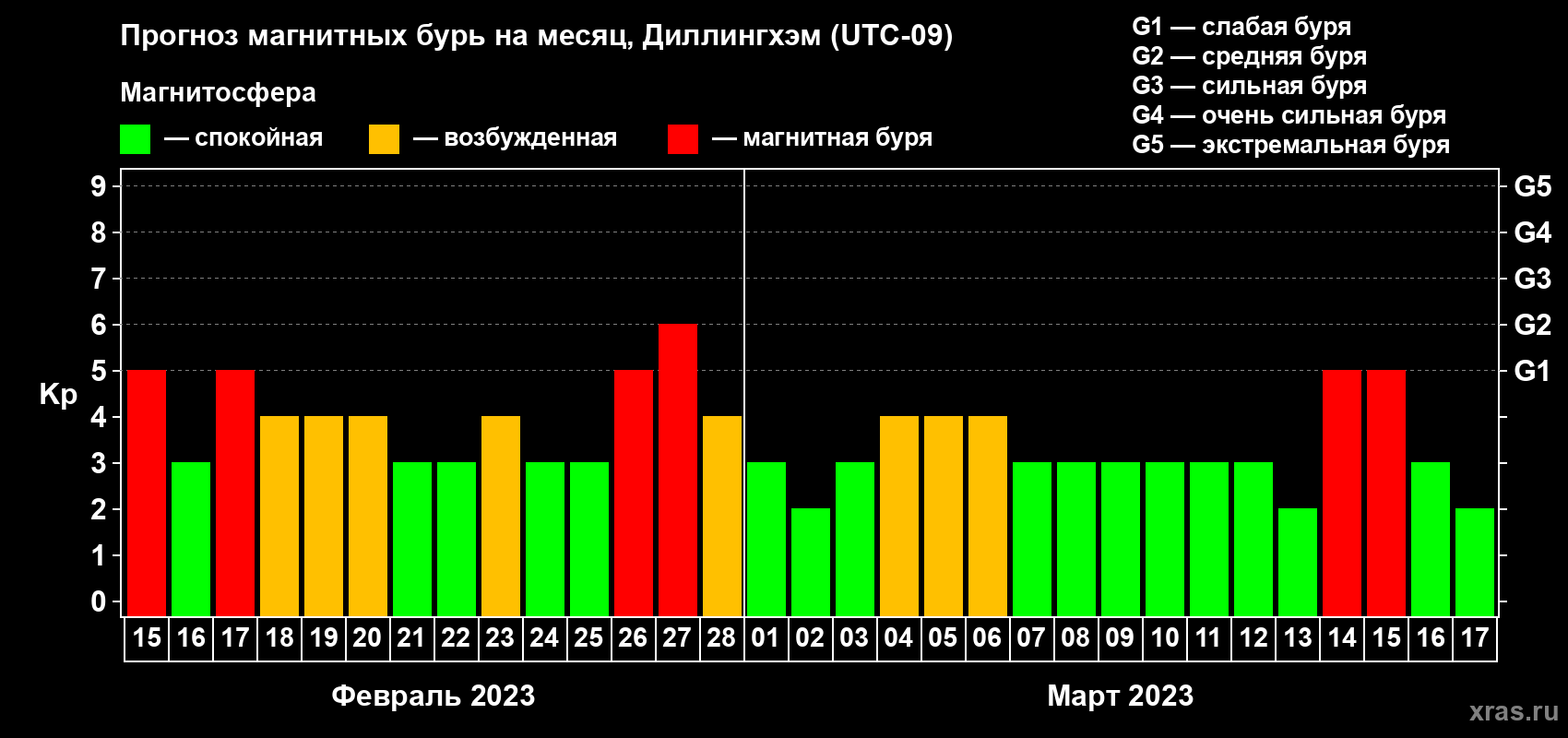 Прогноз магнитных бурь в Диллингхэме — 15 февраля 2023 года