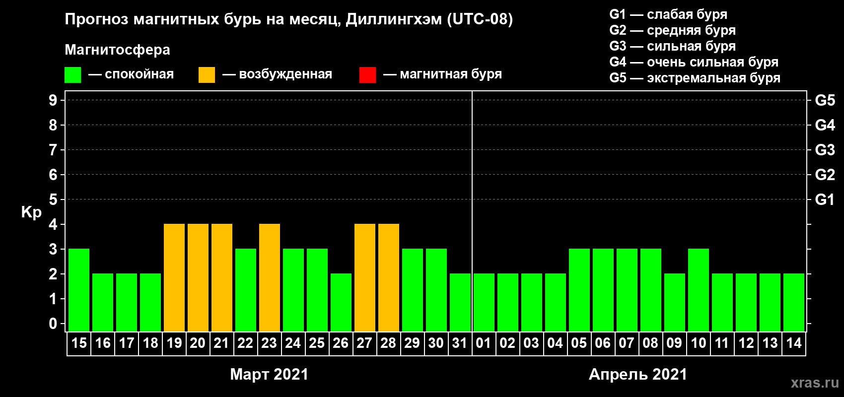 Прогноз максимального суточного геомагнитного индекса Kp на 1 месяц (31 день) с 15 марта по 14 апреля 2021 г