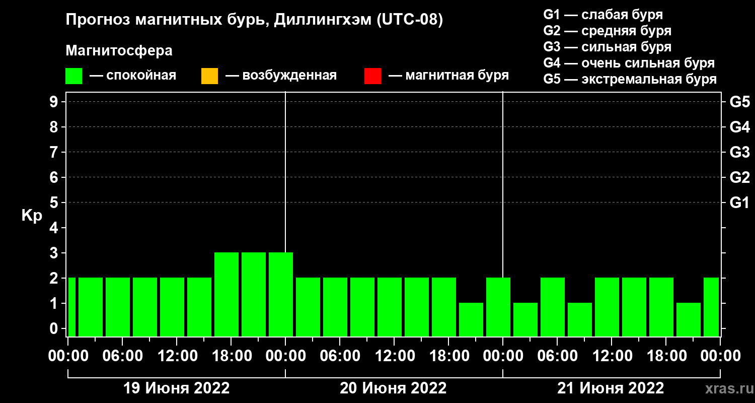 Прогноз магнитных бурь в Диллингхэме на 19 июня 2022 года