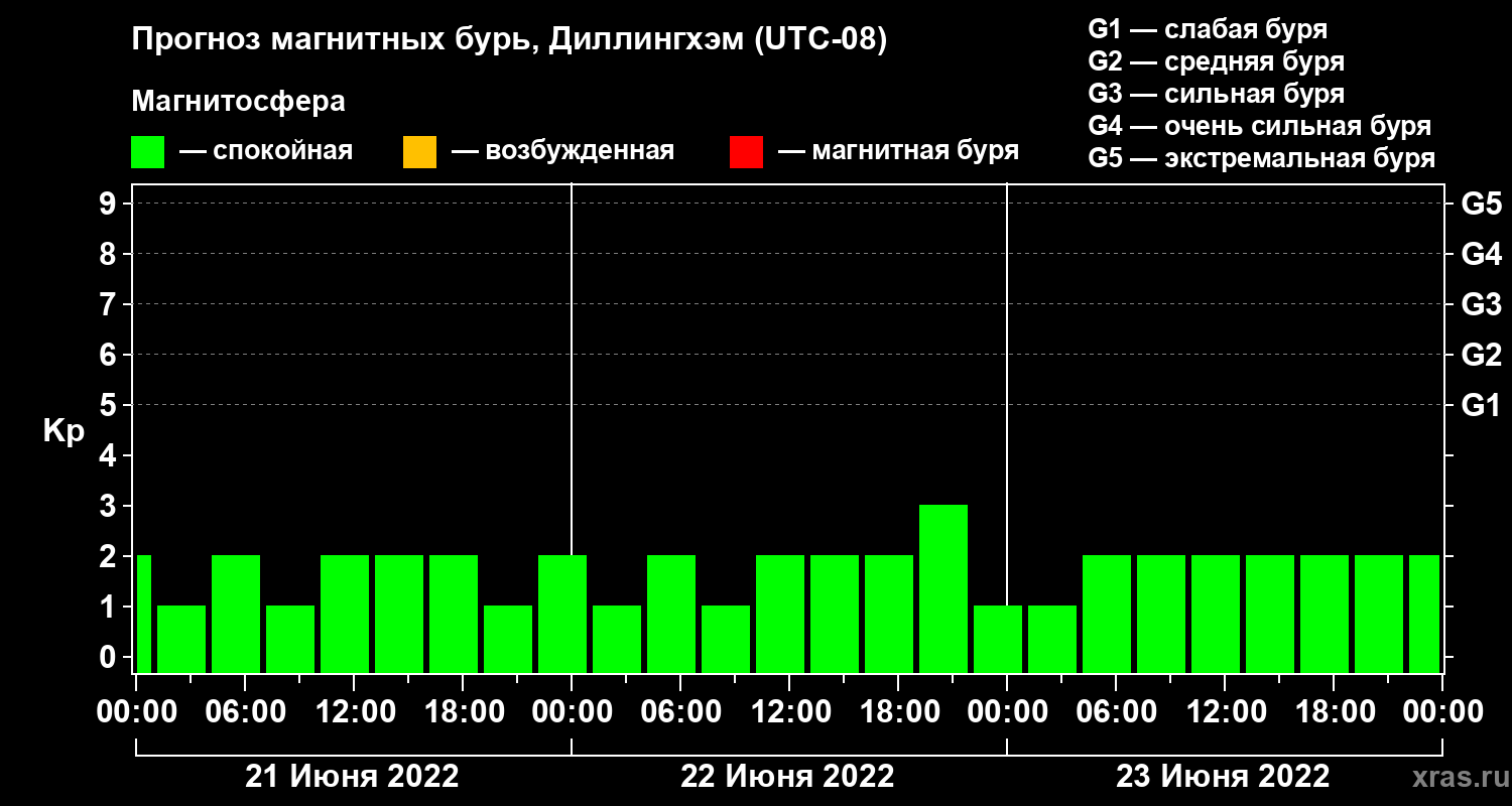 Прогноз магнитных бурь в Диллингхэме на 21 июня 2022 года