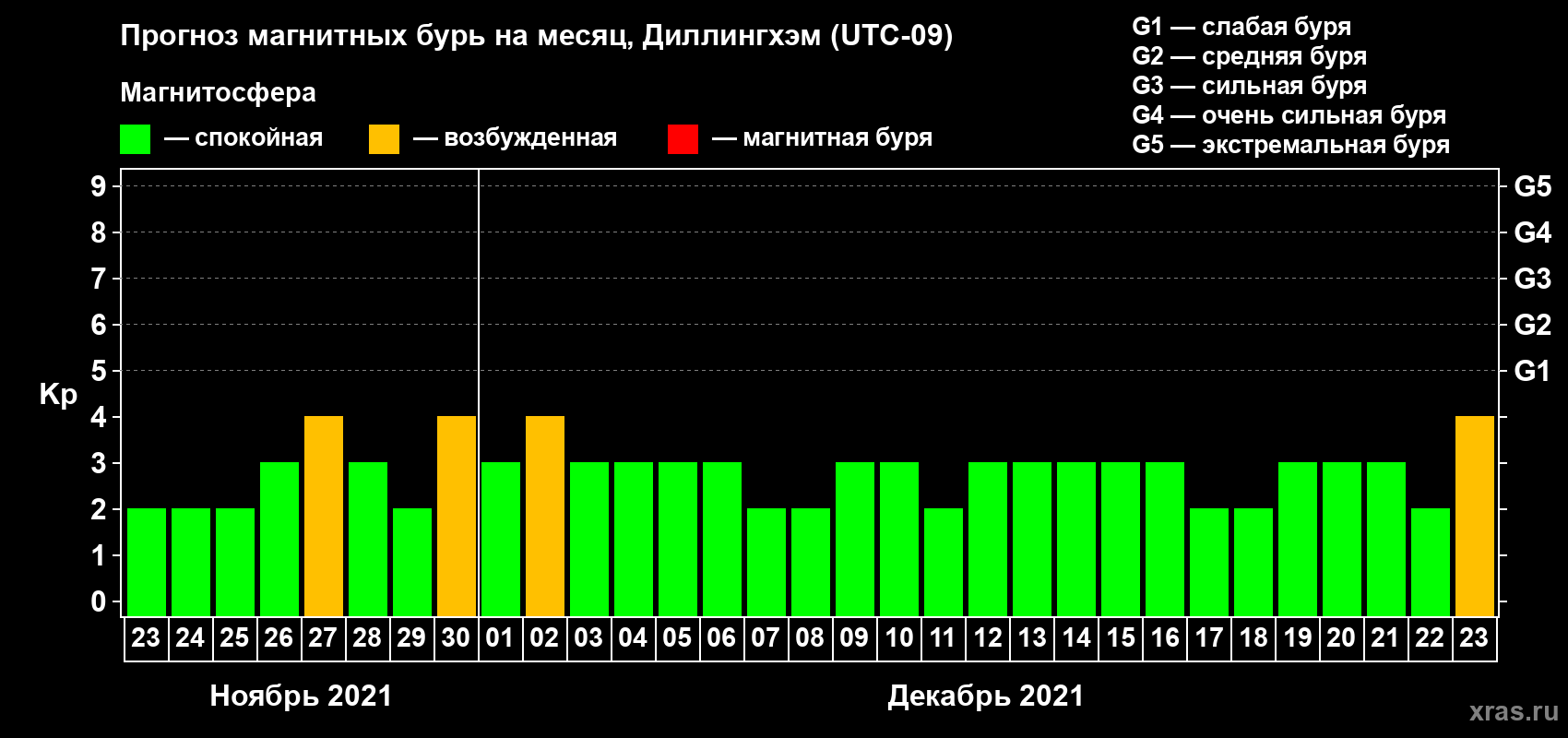 Прогноз магнитных бурь в Диллингхэме на 23 ноября 2021 года
