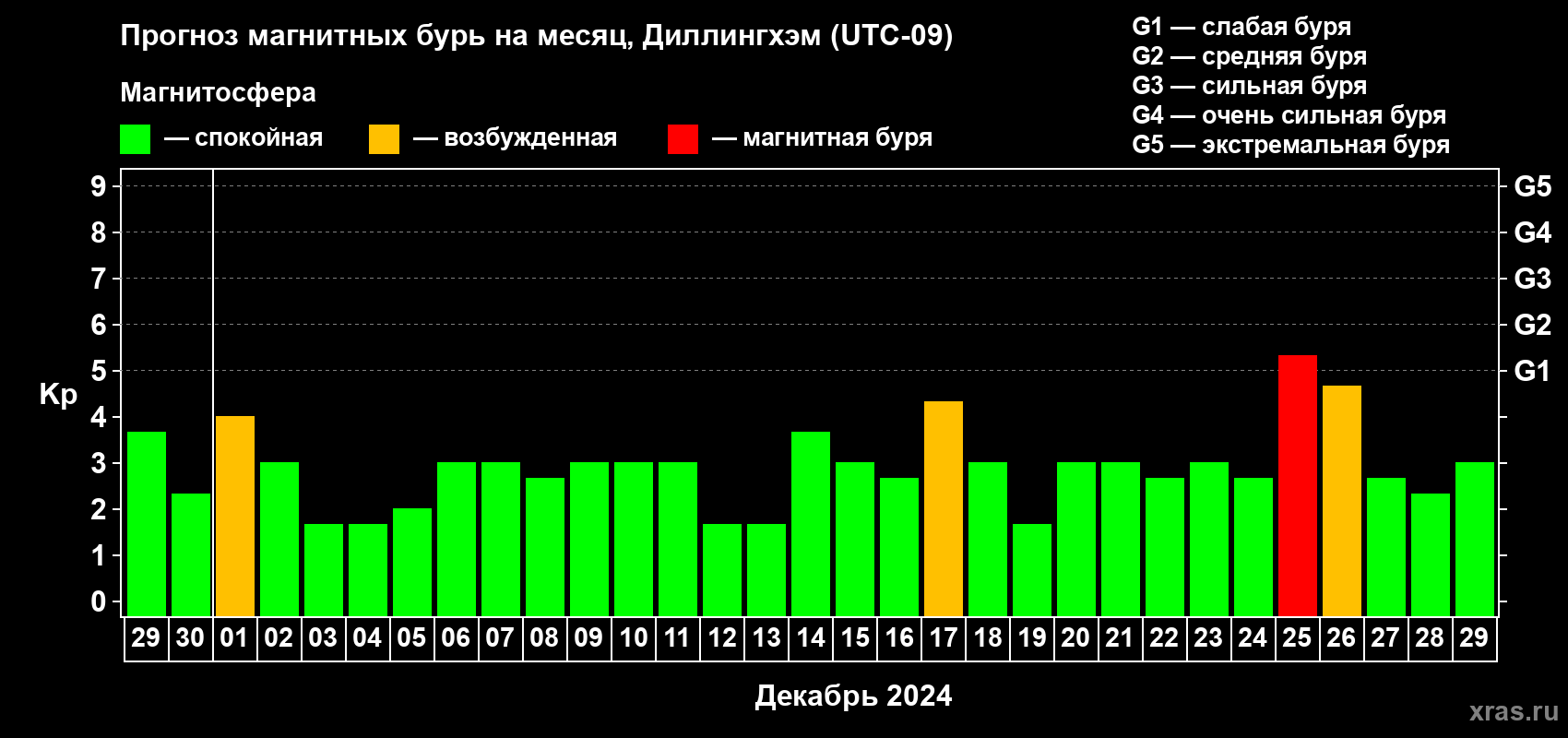 Прогноз магнитных бурь в Диллингхэме на 29 ноября 2024 года