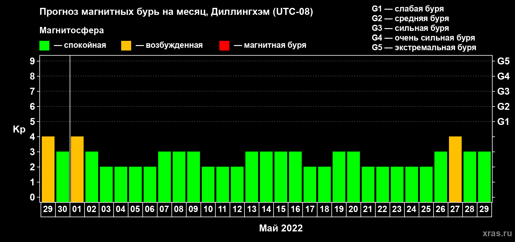 Прогноз магнитных бурь в Диллингхэме на 29 апреля 2022 года
