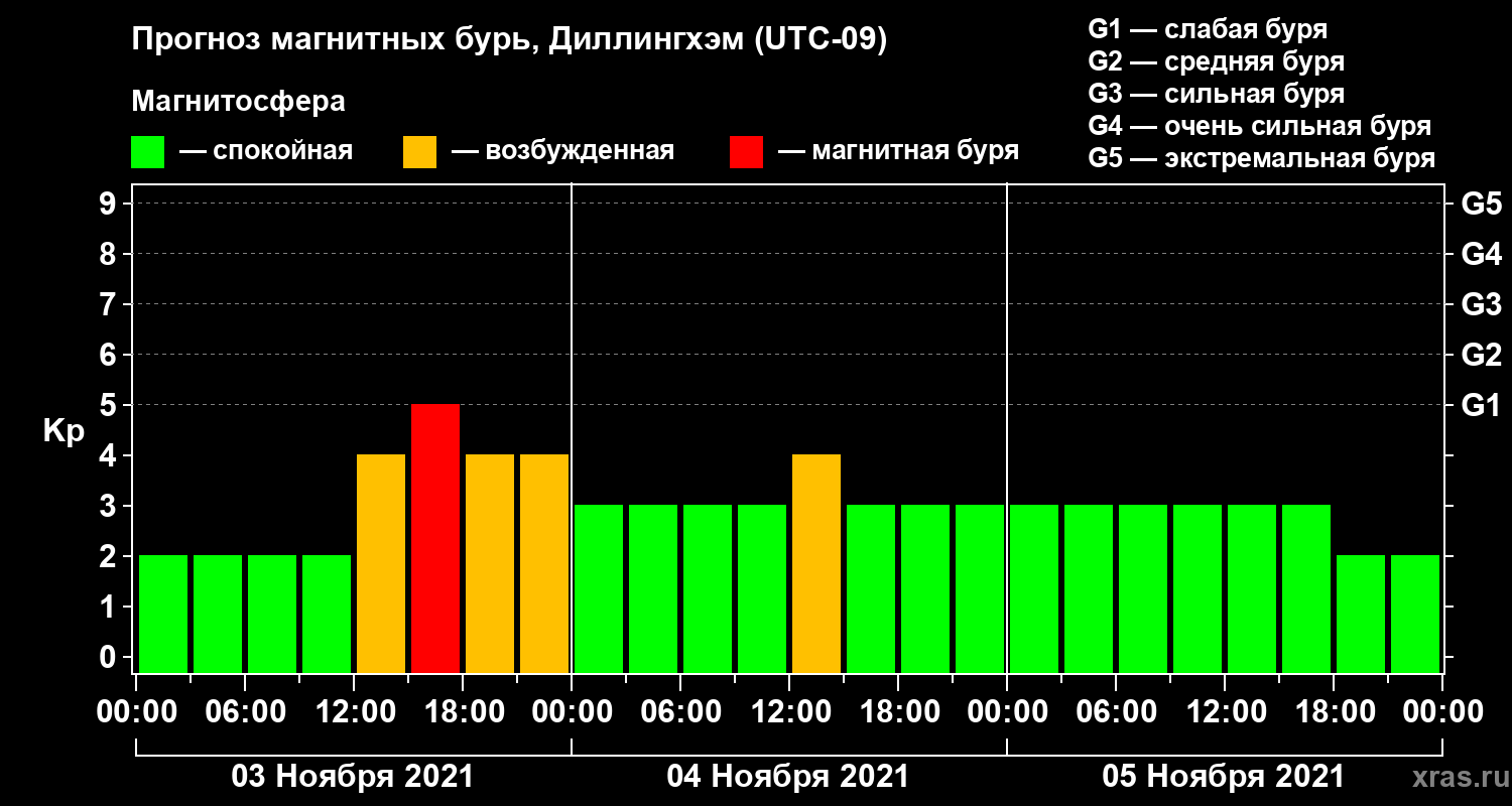 Прогноз магнитных бурь в Диллингхэме на 3 ноября 2021 года