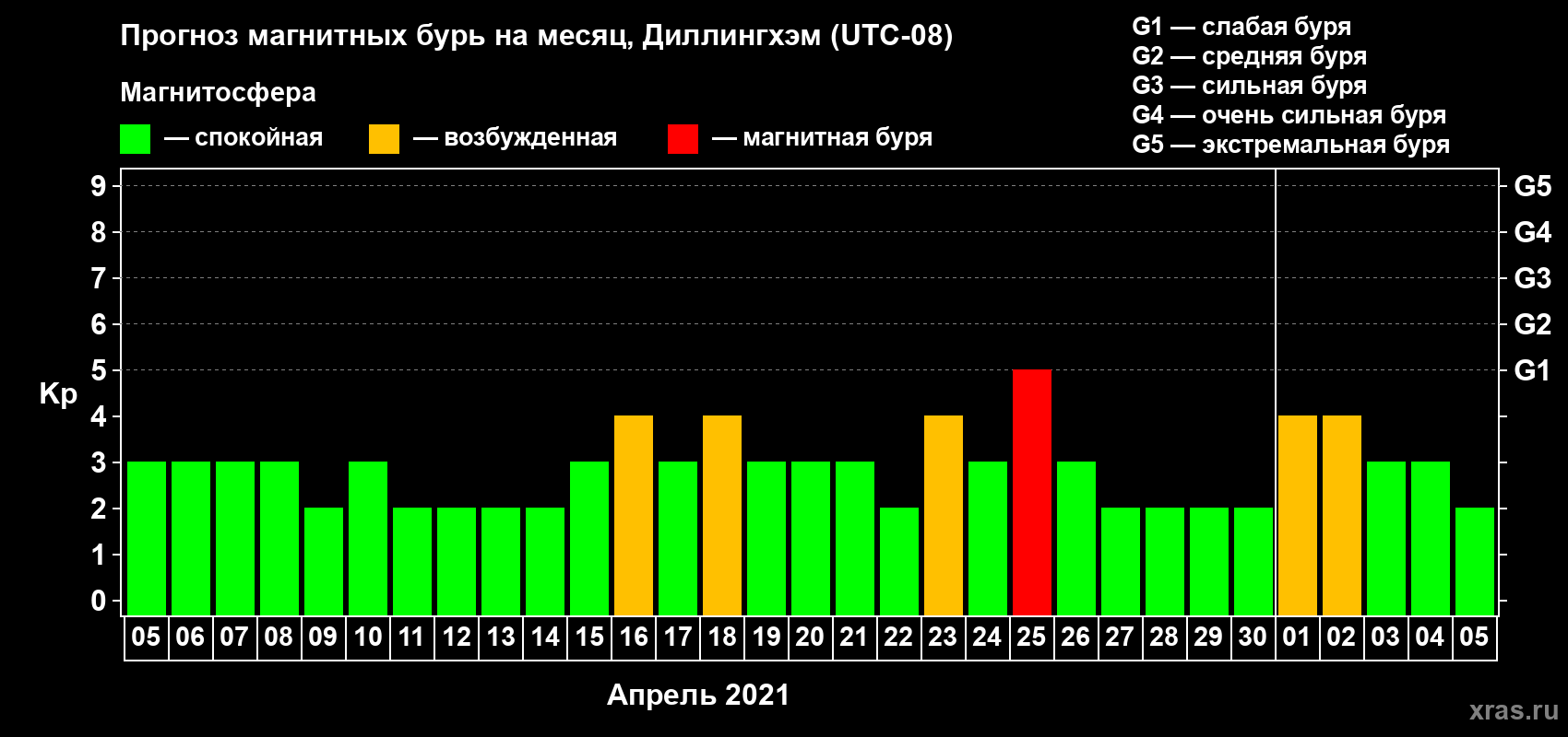 Прогноз магнитных бурь в Диллингхэме на 5 апреля 2021 года