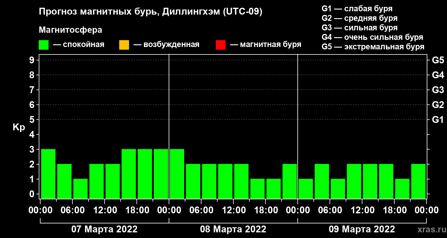 Прогноз магнитных бурь в Диллингхэме на 7 марта 2022 года