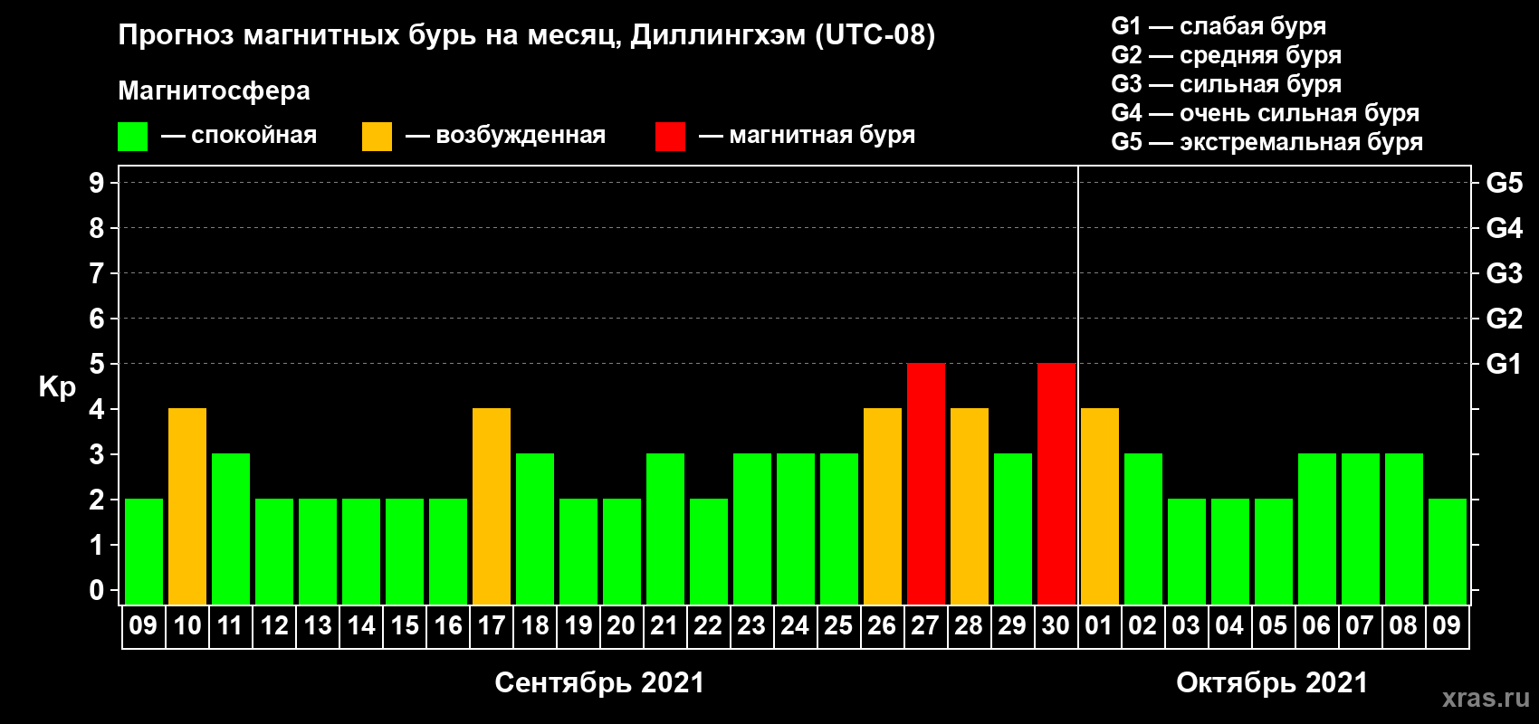Прогноз магнитных бурь в Диллингхэме на 9 сентября 2021 года