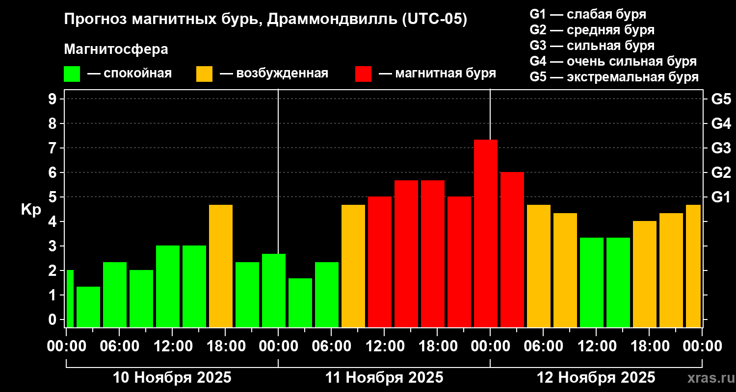 Прогноз магнитных бурь в Драммондвилле — 10 ноября 2025 года