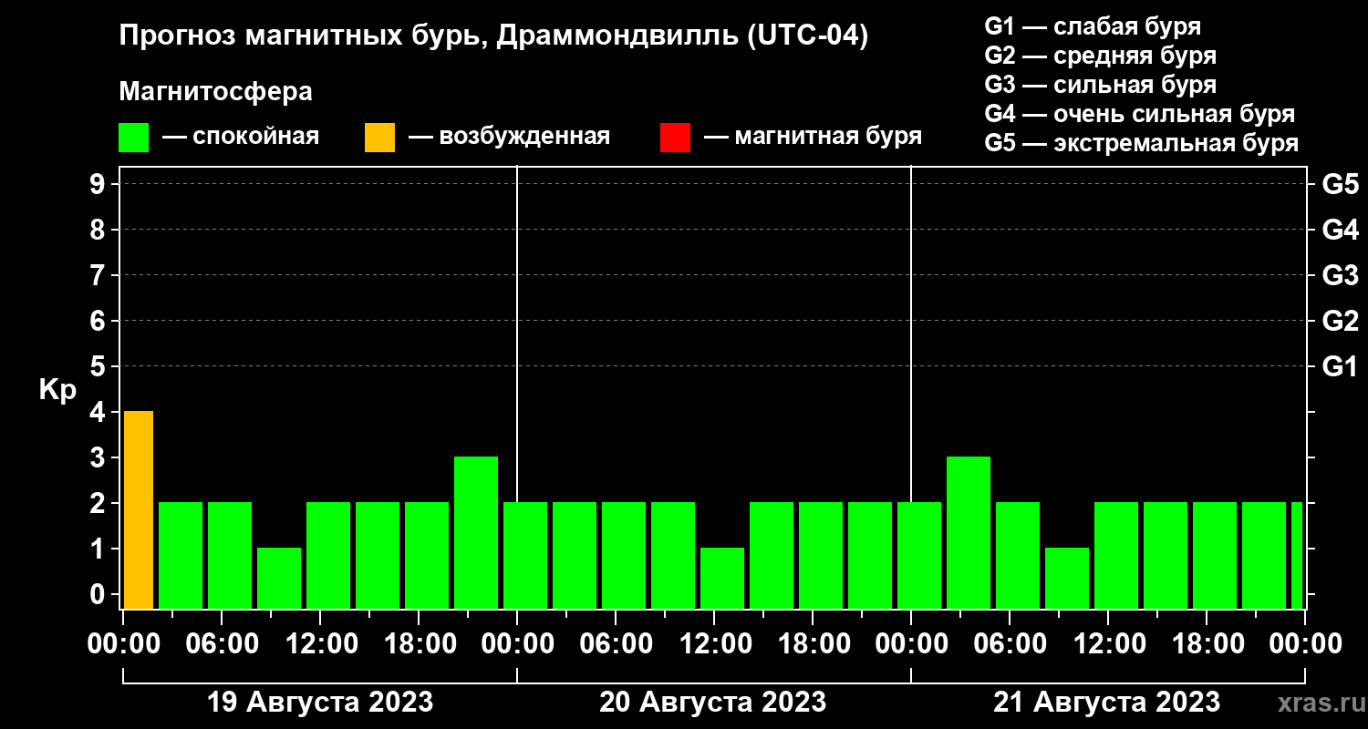 Прогноз магнитных бурь в Драммондвилле на 19 августа 2023 года