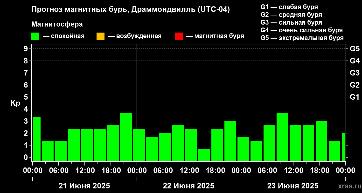 Прогноз магнитных бурь в Драммондвилле — 21 июня 2025 года
