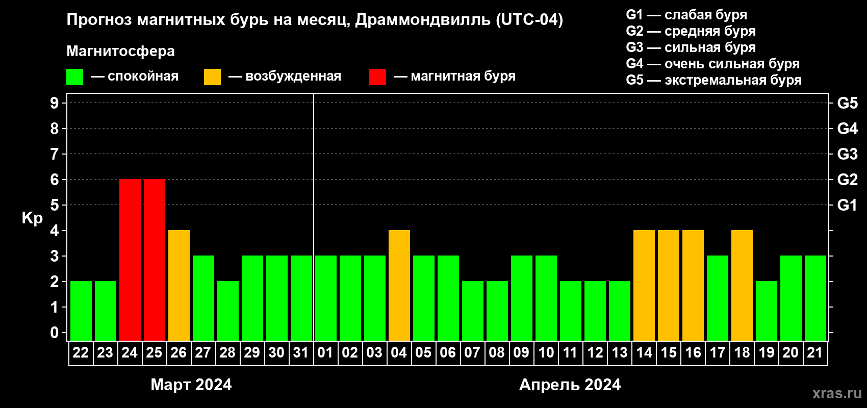 Прогноз магнитных бурь в Драммондвилле на 22 марта 2024 года
