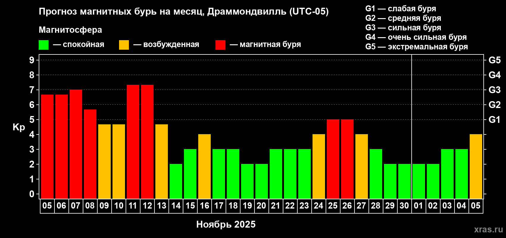 Прогноз магнитных бурь в Драммондвилле — 5 ноября 2025 года