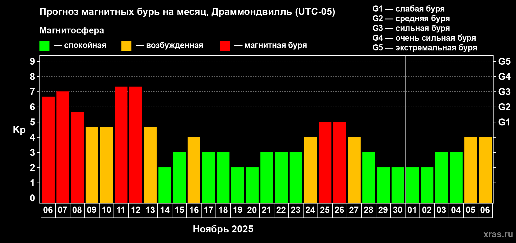 Прогноз магнитных бурь в Драммондвилле — 6 ноября 2025 года