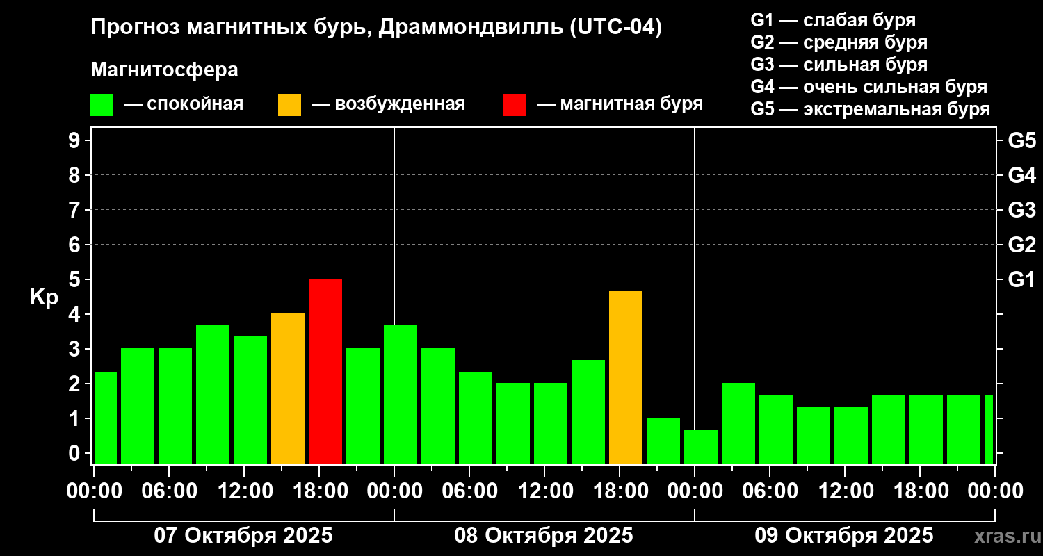 Прогноз магнитных бурь в Драммондвилле — 7 октября 2025 года