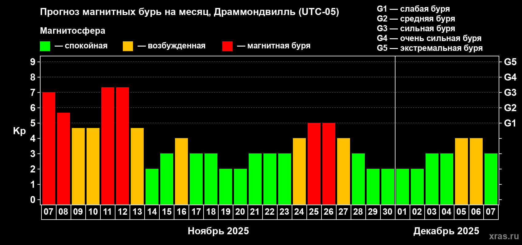 Прогноз магнитных бурь в Драммондвилле — 7 ноября 2025 года