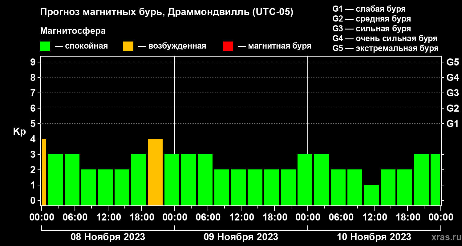 Прогноз магнитных бурь в Драммондвилле — 8 ноября 2023 года