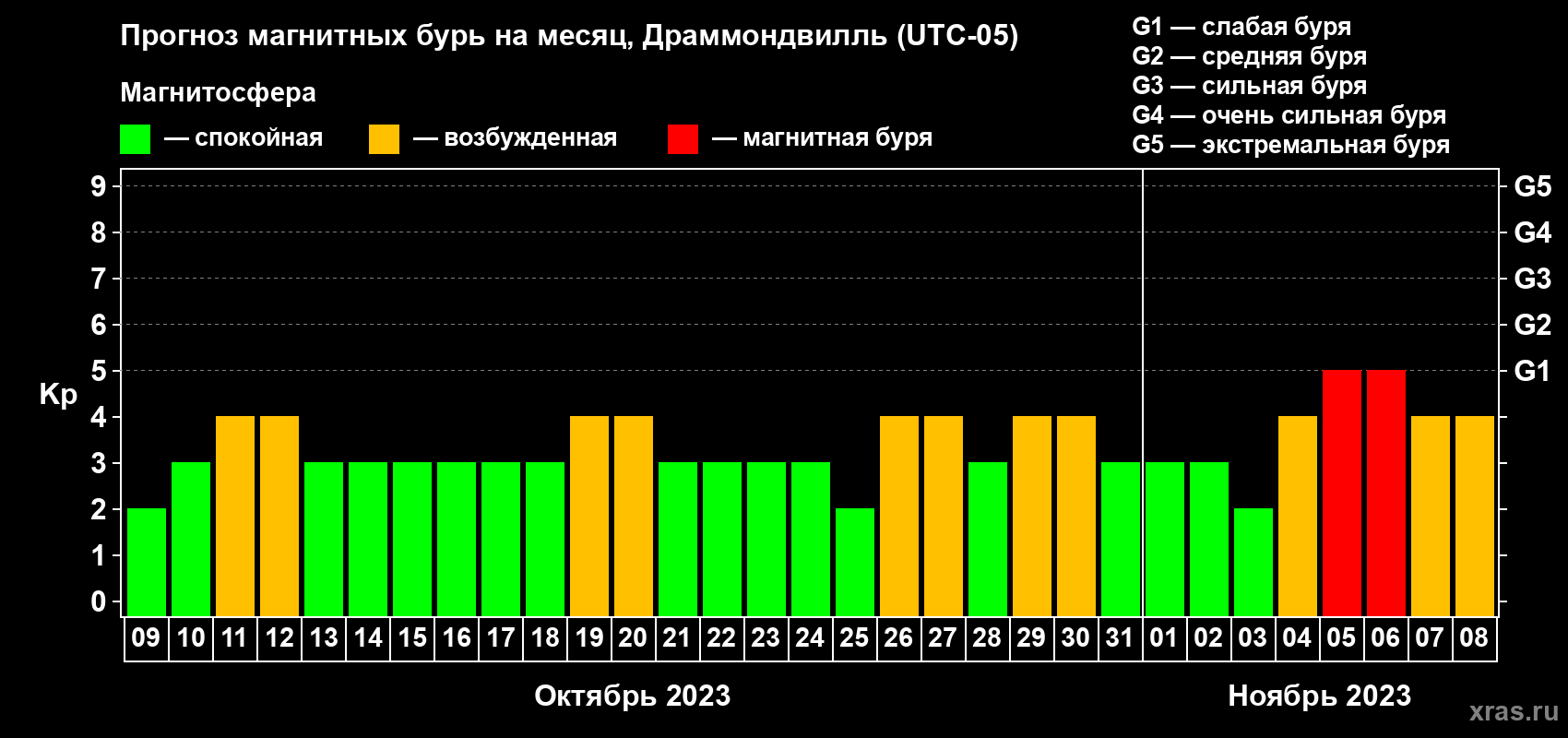 Прогноз магнитных бурь в Драммондвилле — 9 октября 2023 года